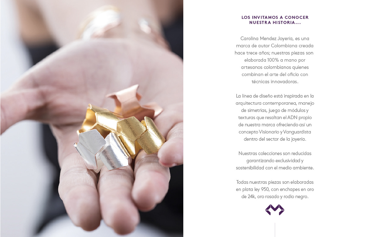 Es una marca de autor colombiana creada hace trece años; nuestras piezas son elaboradas 100% a mano por artesanos colombianos quienes combinan el arte del oficio con técnicas innovadoras. La línea de diseño está inspirada en la arquitectura contemporánea, el manejo de simetrías, el juego de módulos y texturas que resaltan el ADN propio de nuestra marca, ofreciendo así un concepto visionario y vanguardista dentro del sector de la joyería. Nuestras colecciones son reducidas, garantizando exclusividad y sostenibilidad con el medio ambiente. Todas nuestras piezas son elaboradas en plata ley 950, con enchapes en oro de 24k, oro rosado y rodio negro.