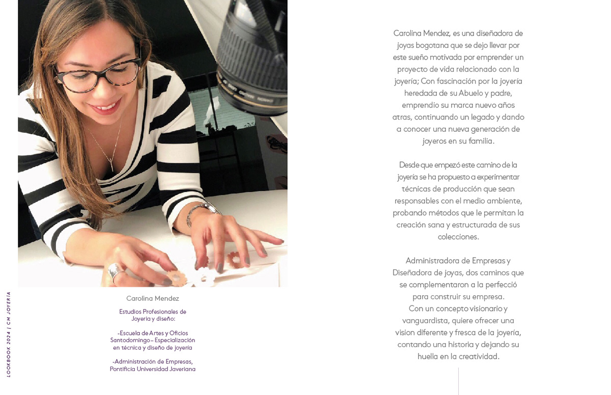 Carolina Méndez es una diseñadora de joyas bogotana que se dejó llevar por este sueño, motivada por emprender un proyecto de vida relacionado con la joyería. Con una fascinación por el oficio heredada de su abuelo y su padre, emprendió su marca años atrás, continuando un legado y dando a conocer una nueva generación de joyeros en su familia.